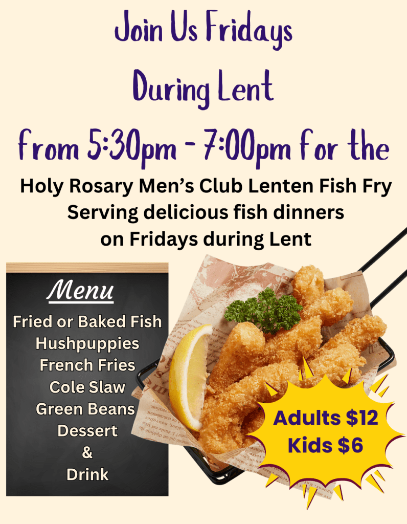 Join us on Fridays during Lent for our Men’s Club Lenten Fish Fry. The first Fish Fry is February 20 at 5:30 p.m. in the school cafeteria.
